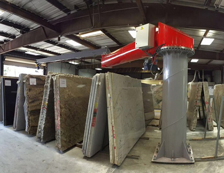 Grúa Giratoria con dos brazos: mejora las operaciones en lugares de difícil acceso con estrechas esquinas, pilares, etc. Permite el movimiento del material tanto en locales interiores como exteriores. Es una solución inteligente para optimizar los espacios del taller y los trabajos.